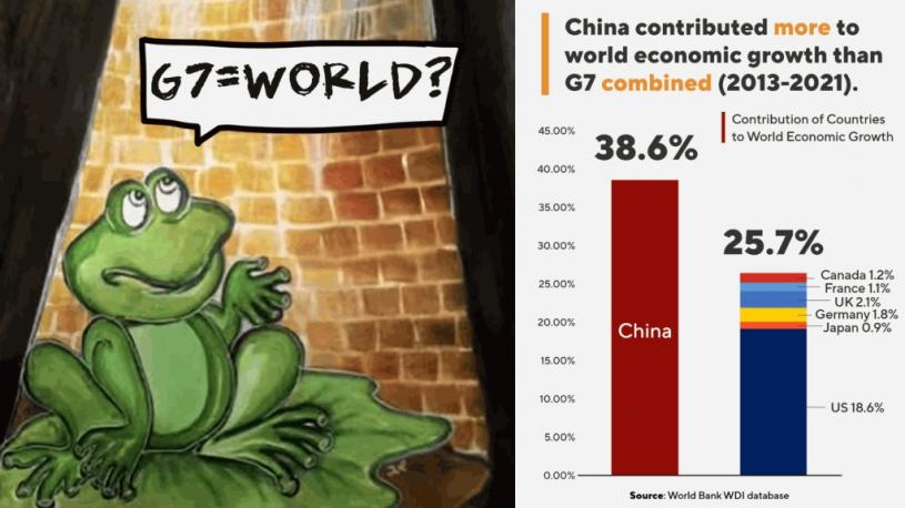 華春瑩貼出三張圖片,其中一張描繪了一隻青蛙坐於井底,並問道:「G7=WORLD(世界)?」另兩張圖分別指出10年來中國對世界經濟增長的貢獻(38.6%)超過G7成員國總和(25.7%),以及G7國家人口總數和土地面積在全球的佔比分別只有10%和16%。